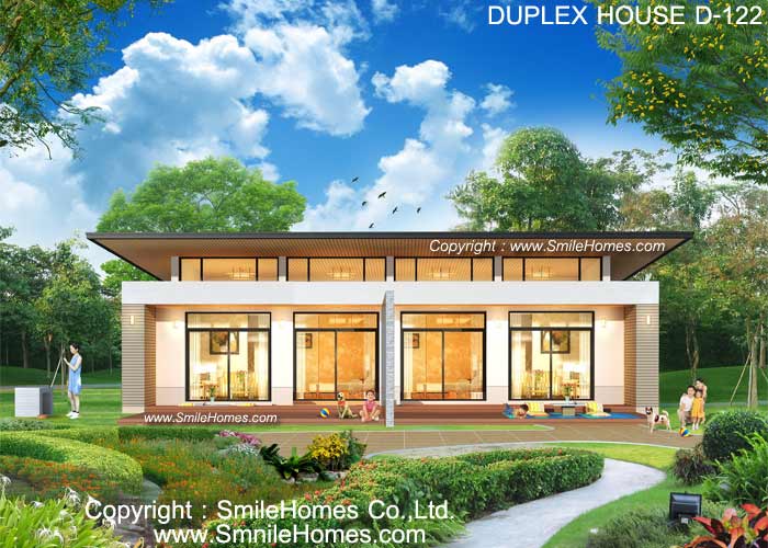 แบบบ้านแฝดชั้นเดียว D-122 จำนวน 2 หลัง เหมาะสำหรับนำไปสร้างสำหรับ 2 ครอบครัว ในที่ดินแปลงเดียวกัน เป็นสไตล์ Modern รูปทรงสวยงาม โดดเด่น มีเอกลักษณ์เฉพาะตัว : เป็นบ้านแฝดชั้นเดียว จำนวน 2 หลัง แต่ละหลังมี 2 ห้องนอน 2 ห้องน้ำ พื้นที่ใช้สอยต่อหลัง 130 ตร.ม. ภายในมีส่วนห้องรับแขก ห้องอาหาร ห้องทำงาน ห้องครัว มีห้องนอน 2 ห้อง และห้องน้ำ 2 ห้อง รายละเอียดแบบบ้านแฝดชั้นเดียว D-122 **ส่วนจอดรถ ** สามารถจัดที่จอดรถด้านหน้าได้ จำนวน 3 - 4 คัน ขึ้นกับลักษณะที่ดินของท่าน ** หลังคา