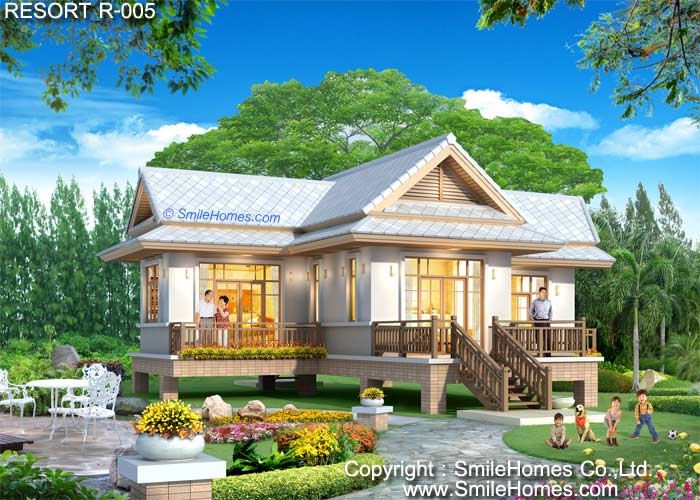 แบบรีสอร์ทสไตล์ Modern Thai เหมาะสำหรับนำไปสร้างเป็นรีสอร์ทริมทะเล ริมเชิงเขา หรือริมแม่น้ำ สำหรับให้เช่าได้ : เป็นรีสอร์ทชั้นเดียว มี 2 ห้องนอน 1 ห้องน้ำ รูปทรงภายนอกสวยงาม สไตล์ไทยประยุกต์ เน้นทางเข้าบ้าน ด้วยบันไดทางขึ้นบ้าน เป็นเฉลียงนั่งเล่น นอกชานขนาดใหญ่ ภายในเป็น ห้องโถงอเนกประสงค์แบบโปร่งโล่ง ใช้เป็นส่วนนั่งเล่น ส่วนทานอาหาร มีส่วน Pantry เล็กๆ สำหรับเตรียมอาหาร มีห้องนอนขนาดกลาง 2 ห้อง ที่มีระเบียงส่วนตัวด้านนอก และห้องน้ำที่มีสุขภัณฑ์ครบชุด ชั้นล่าง