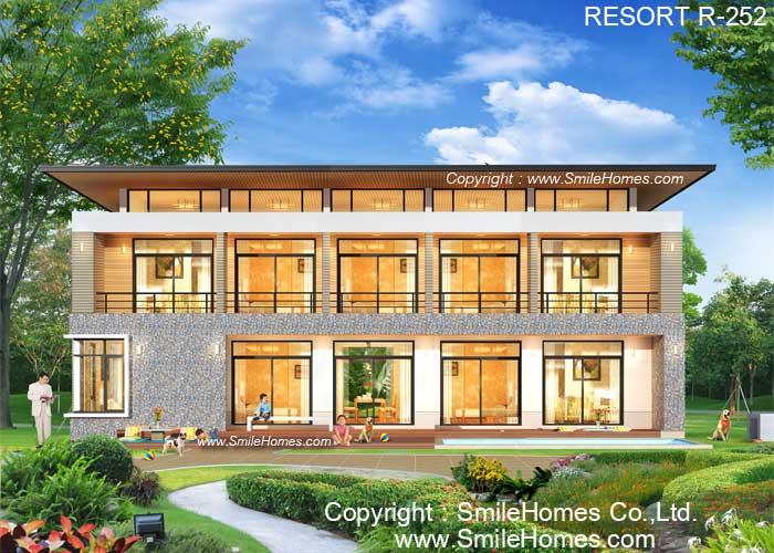 แบบรีสอร์ท 2 ชั้น R-252 เหมาะสำหรับนำไปสร้างเป็นรีสอร์ทริมทะเล ริมเชิงเขา หรือริมแม่น้ำ : เป็นรีสอร์ท 2 ชั้น จำนวน 14 ห้อง พื้นที่ใช้สอย 738 ตร.ม. เหมาะสำหรับที่ดินขนาด 135 ตร.วา ขึ้นไป เป็นอาคารสไตล์ MODERN รูปทรงสวยงาม โดดเด่น มีเอกลักษณ์เฉพาะตัว ชั้นล่างมีส่วนโถงต้อนรับ ส่วนสำนักงาน ร้านอาหาร และส่วนห้องพักให้ 5 ห้อง ที่มีทั้งห้องน้ำ และระเบียงส่วนตัว ชั้น 2 เป็นห้องพัก 9 ห้อง ภายในอาคารมีทั้งบันไดหลัก และบันไดหนีไฟ