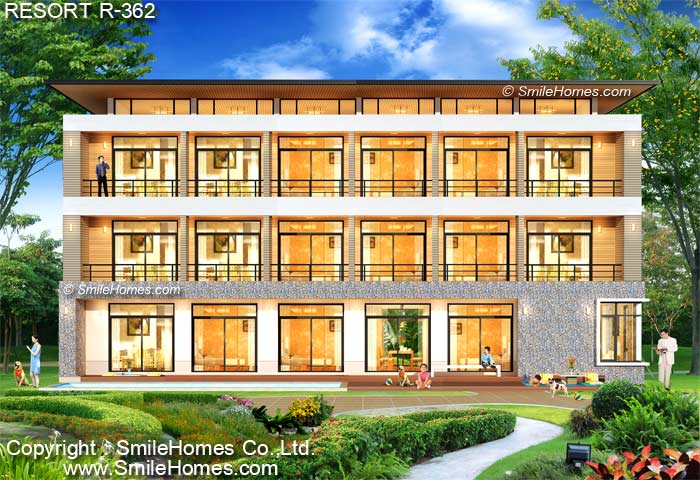 แบบรีสอร์ท 3 ชั้น R-362 เหมาะสำหรับนำไปสร้างเป็นรีสอร์ทริมทะเล ริมเชิงเขา หรือริมแม่น้ำ : เป็นรีสอร์ท 3 ชั้น จำนวน 30 ห้อง พื้นที่ใช้สอย 1,100 ตร.ม. เหมาะสำหรับที่ดินขนาด 180 ตร.วา ขึ้นไป เป็นอาคารสไตล์ MODERN รูปทรงสวยงาม โดดเด่น มีเอกลักษณ์เฉพาะตัว ชั้นล่างมีส่วนโถงต้อนรับ ส่วนสำนักงาน ร้านอาหาร และส่วนห้องพักให้ 8 ห้อง ที่มีทั้งห้องน้ำ และระเบียงส่วนตัว ชั้น 2 - ชั้น 3 เป็นห้องพักชั้นละ 11 ห้อง พร้อมห้องน้ำ และระเบียงส่วนตัว ภายในอาคารมีทั้งบันไดหลัก และบันไดหนีไฟ
