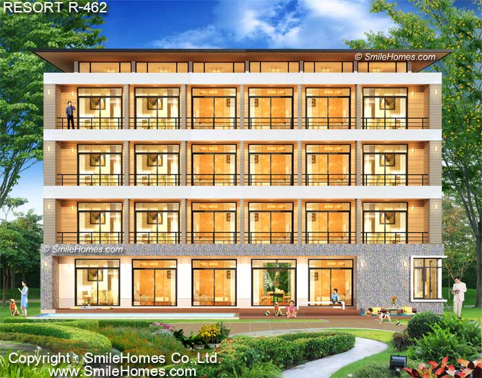 แบบรีสอร์ท 4 ชั้น R-462 เหมาะสำหรับนำไปสร้างเป็นรีสอร์ทริมทะเล ริมเชิงเขา หรือริมแม่น้ำ : เป็นรีสอร์ท 4 ชั้น จำนวน 40 ห้อง พื้นที่ใช้สอย 1,585 ตร.ม. เหมาะสำหรับที่ดินขนาด 180 ตร.วา ขึ้นไป เป็นอาคารสไตล์ MODERN รูปทรงสวยงาม โดดเด่น มีเอกลักษณ์เฉพาะตัว ชั้นล่างมีส่วนโถงต้อนรับ ส่วนสำนักงาน ร้านอาหาร และส่วนห้องพักให้ 7 ห้อง ที่มีทั้งห้องน้ำ และระเบียงส่วนตัว ชั้น 2 - ชั้น 4 เป็นห้องพักชั้นละ 11 ห้อง พร้อมห้องน้ำ และระเบียงส่วนตัว ภายในอาคารมีทั้งบันไดหลัก และบันไดหนีไฟ