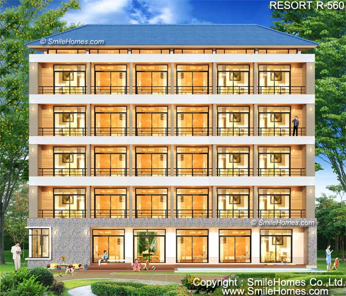 แบบรีสอร์ท R-560 : รีสอร์ท 5 ชั้น จำนวน 50 ห้อง พื้นที่ใช้สอย 1,975 ตร.ม. เหมาะสำหรับที่ดินขนาด 180 ตร.วา ขึ้นไป เป็นอาคารสไตล์ MODERN รูปทรงสวยงาม โดดเด่น มีเอกลักษณ์เฉพาะตัว ชั้นล่างมีส่วนโถงต้อนรับ ส่วนสำนักงาน ร้านอาหาร ร้านค้า หรือร้านกาแฟ และส่วนห้องพักให้เช่า 6 ห้อง ที่มีทั้งห้องน้ำ และระเบียงส่วนตัว ชั้น 2 - ชั้น 5 เป็นห้องพักให้เช่าชั้นละ 11 ห้อง ในอาคารมีทั้งบันไดหลัก และบันไดหนีไฟ