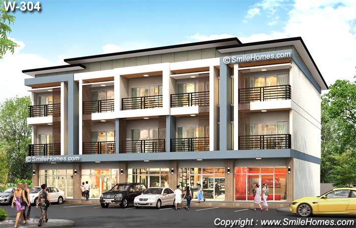 แบบอาคารพาณิชย์ 3 ชั้น จำนวน 5 ห้อง W-304 เหมาะสำหรับนำไปสร้างขาย สำหรับทำเป็น ร้านค้า หรือทำเป็นสำนักงาน หรือใช้เป็นโฮมออฟฟิศ เป็นอาคารสไตล์ Modern รูปทรงทันสมัย สวยงาม โดดเด่น มีเอกลักษณ์เฉพาะตัว : เป็นอาคารพาณิชย์ 3 ชั้น จำนวน 5 ห้อง โดยตัวอาคารชั้น 1-2 เป็นส่วนสำหรับทำเป็นร้านค้า หรือสำนักงาน ส่วนชั้น 3 เป็นส่วนพักอาศัย มี 2 ห้องนอน 2 ห้องน้ำ รายละเอียดแบบอาคารพาณิชย์ 3 ชั้น จำนวน 5 ห้อง W-304 ชั้น 2 ชั้น 3 หลังคา