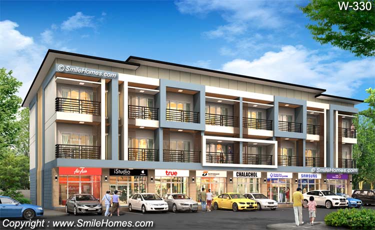 แบบอาคารพาณิชย์ 3 ชั้น จำนวน 8 ห้อง W-330 เหมาะสำหรับนำไปสร้างขาย สำหรับทำเป็น ร้านค้า หรือทำเป็นสำนักงาน หรือใช้เป็นโฮมออฟฟิศ เป็นอาคารสไตล์ Modern รูปทรงทันสมัย สวยงาม โดดเด่น มีเอกลักษณ์เฉพาะตัว : เป็นอาคารพาณิชย์ 3 ชั้น จำนวน 8 ห้อง โดยตัวอาคารชั้น 1-2 เป็นส่วนสำหรับทำเป็นร้านค้า หรือสำนักงาน ส่วนชั้น 3 เป็นส่วนพักอาศัย มี 2 ห้องนอน และ ห้องน้ำ รายละเอียดแบบอาคารพาณิชย์ 3 ชั้น จำนวน 8 ห้อง W-330 ชั้น 2 ชั้น 3 หลังคา