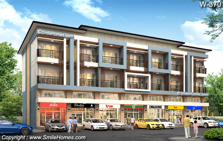 แบบอาคารพาณิชย์ 3 ชั้นครึ่ง จำนวน 8 ห้อง W-370 เหมาะสำหรับนำไปสร้างขาย สำหรับทำเป็น ร้านค้า หรือทำเป็นสำนักงาน หรือใช้เป็นโฮมออฟฟิศ เป็นอาคารสไตล์ Modern รูปทรงทันสมัย สวยงาม โดดเด่น มีเอกลักษณ์เฉพาะตัว : เป็นอาคารพาณิชย์ 3 ชั้นครึ่ง จำนวน 8 ห้อง โดยตัวอาคารชั้น 1-2 เป็นส่วนสำหรับทำเป็นร้านค้า หรือสำนักงาน ส่วนชั้น 3 เป็นส่วนพักอาศัย มี 2 ห้องนอน 3 ห้องน้ำ รายละเอียดแบบอาคารพาณิชย์ 3 ชั้นครึ่ง จำนวน 8 ห้อง W-370 ชั้นลอย ชั้น 2 ชั้น 3 หลังคา