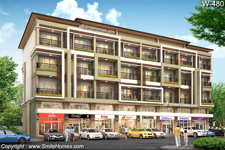 แบบอาคารพาณิชย์ 4 ชั้นครึ่ง จำนวน 8 ห้อง W-480 เหมาะสำหรับนำไปสร้างขาย สำหรับทำเป็น ร้านค้า หรือทำเป็นสำนักงาน หรือใช้เป็นโฮมออฟฟิศ เป็นอาคารสไตล์ Modern รูปทรงทันสมัย สวยงาม โดดเด่น มีเอกลักษณ์เฉพาะตัว : เป็นอาคารพาณิชย์ 4 ชั้นครึ่ง จำนวน 8 ห้อง โดยตัวอาคารชั้น 1-3 เป็นส่วนสำหรับทำเป็นร้านค้า หรือสำนักงาน ส่วนชั้น 4 เป็นส่วนพักอาศัย มี 2 ห้องนอน 3 ห้องน้ำ รายละเอียดแบบอาคารพาณิชย์ 4 ชั้นครึ่ง จำนวน 8 ห้อง W-480 ชั้นลอย ชั้น 2 ชั้น 3 ชั้น 4 หลังคา