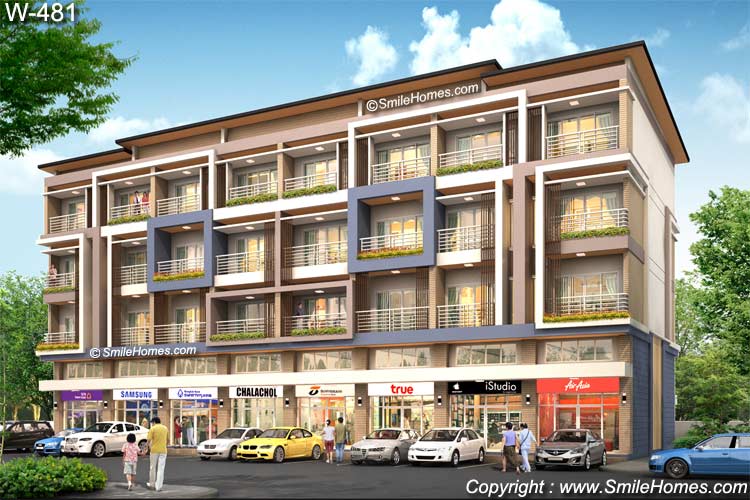 แบบอาคารพาณิชย์ 4 ชั้นครึ่ง จำนวน 8 ห้อง W-481 เหมาะสำหรับนำไปสร้างขาย สำหรับทำเป็น ร้านค้า หรือทำเป็นสำนักงาน หรือใช้เป็นโฮมออฟฟิศ เป็นอาคารสไตล์ Modern รูปทรงทันสมัย สวยงาม โดดเด่น มีเอกลักษณ์เฉพาะตัว : เป็นอาคารพาณิชย์ 3 ชั้นครึ่ง จำนวน 8 ห้อง โดยตัวอาคารชั้น 1-4 เป็นส่วนสำหรับทำเป็นร้านค้า หรือสำนักงาน และห้องน้ำ 4 ห้อง รายละเอียดแบบอาคารพาณิชย์ 4 ชั้นครึ่ง จำนวน 8 ห้อง W-481 ชั้นลอย ชั้น 2 ชั้น 3 ชั้น 4 หลังคา