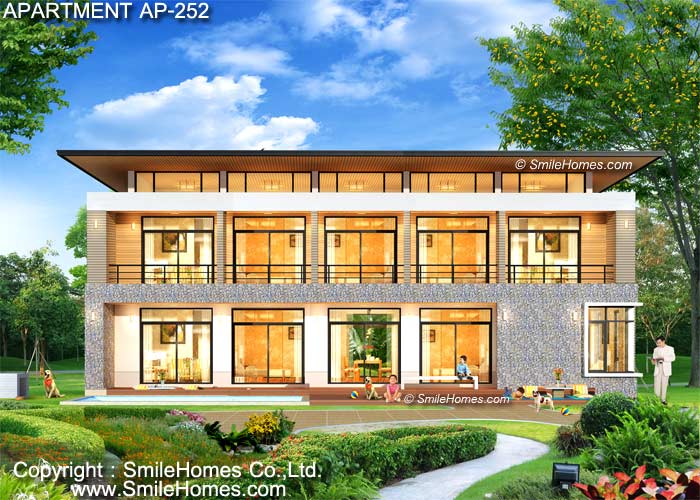 แบบอพาร์ทเมนท์ AP-252 : อพาร์ตเมนต์ 2 ชั้น จำนวน 15 ห้อง พื้นที่ใช้สอย 736 ตร.ม. เหมาะสำหรับที่ดินขนาด 135 ตร.วา ขึ้นไป เป็นอาคารสไตล์ MODERN รูปทรงสวยงาม โดดเด่น มีเอกลักษณ์เฉพาะตัว ชั้นล่างมีส่วนโถงต้อนรับ ส่วนสำนักงาน ร้านอาหาร และส่วนห้องพักให้เช่า 6 ห้อง ที่มีทั้งห้องน้ำ และระเบียงส่วนตัว ชั้น 2 เป็นห้องพักให้เช่า 9 ห้อง อาคารมีทั้งบันไดหลัก และบันไดหนีไฟ