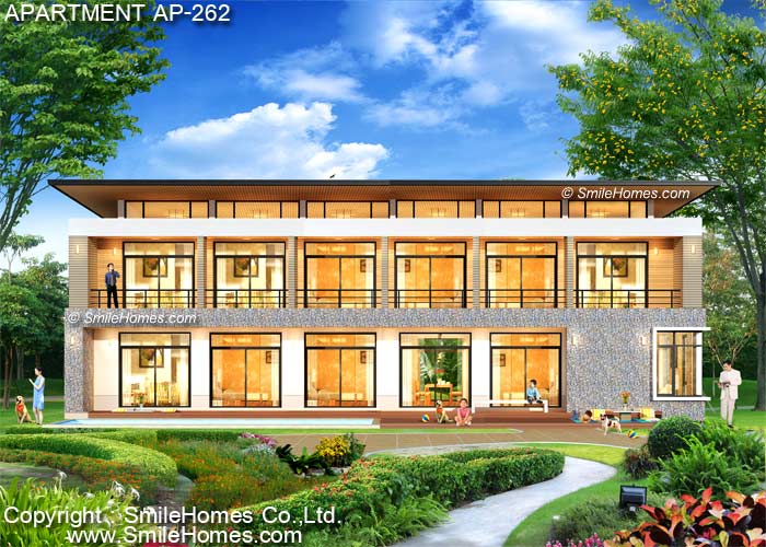 แบบอพาร์ทเมนท์ AP-262 : อพาร์ตเมนต์ 2 ชั้น จำนวน 19 ห้อง พื้นที่ใช้สอย 836 ตร.ม. เหมาะสำหรับที่ดินขนาด 165 ตร.วา ขึ้นไป เป็นอาคารสไตล์ MODERN รูปทรงสวยงาม โดดเด่น มีเอกลักษณ์เฉพาะตัว ชั้นล่างมีส่วนโถงต้อนรับ ส่วนสำนักงาน ร้านอาหาร และส่วนห้องพักให้เช่า 8 ห้อง ที่มีทั้งห้องน้ำ และระเบียงส่วนตัว ชั้น 2 เป็นห้องพักให้เช่า 11 ห้อง อาคารมีทั้งบันไดหลัก และบันไดหนีไฟ