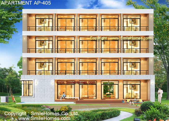 แบบอพาร์ทเมนท์ AP-405 : อพาร์ตเมนต์ 4 ชั้น จำนวน 33 ห้อง พื้นที่ใช้สอย 1,440 ตร.ม. เหมาะสำหรับที่ดินขนาด 160 ตร.วา ขึ้นไป เป็นอาคารสไตล์ MODERN รูปทรงสวยงาม โดดเด่น มีเอกลักษณ์เฉพาะตัว ชั้นล่างมีส่วนโถงต้อนรับ ส่วนสำนักงาน ร้านอาหาร และส่วนห้องพักให้เช่า 6 ห้อง ที่มีทั้งห้องน้ำ และระเบียงส่วนตัว ชั้น 2-4 เป็นห้องพักให้เช่า ชั้นละ 9 ห้อง ภายในอาคารมีทั้งบันไดหลัก และบันไดหนีไฟ