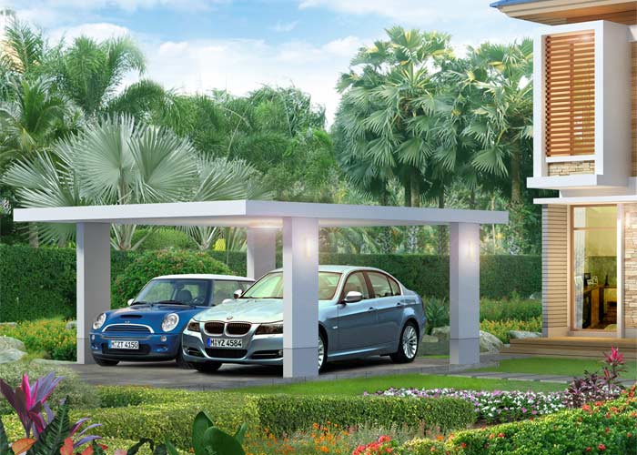 อาคารที่จอดรถ CP-201 จำนวน 2 คัน สไตล์ Modern : รูปทรงภายนอกดูทันสมัย โดดเด่น สวยงาม สร้างแยกออกมาจากตัวบ้าน ** สามารถจัดวางตำแหน่งที่จอดรถ ให้เหมาะสมตามรูปทรงที่ดินของท่านได้ **