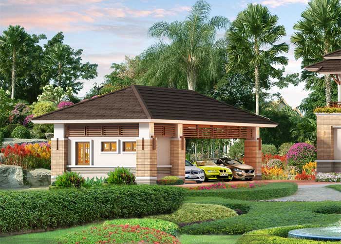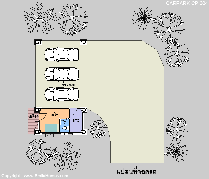 อาคารที่จอดรถ CP-304 จำนวน 3 คัน สไตล์ Modern Oriental : รูปทรงภายนอกดูทันสมัย โดดเด่น สวยงาม สร้างแยกออกมาจากตัวบ้าน ** สามารถจัดวางตำแหน่งที่จอดรถ ให้เหมาะสมตามรูปทรงที่ดินของท่านได้ **