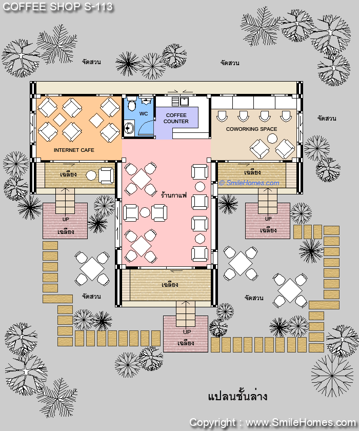 ร้านกาแฟ หรือ Coffee Shop สไตล์ Modern ( สามารถปรับเป็นร้าน Internet Cafe ได้ ) ตัวอาคารยกระดับจากพื้นดิน 1.00 ม. รูปทรงภายนอกเป็นสไตล์ Modern ดูทันสมัย สวยงาม หลังคาเป็น Metal Sheet ที่มีช่องแสง Sky-Light ด้านบน เน้นทางเข้า ด้วยบันไดทางขึ้น มีเฉลียงยาวด้านหน้า ภายในมีส่วนต้อนรับ และส่วนร้านกาแฟแบบโปร่งโล่ง ด้านในมีส่วน Internet Cafe พร้อมระบบ Wi-Fi สำหรับบริการ Internet และมีส่วน Coworking Space เป็นส่วนนั่งทำงาน มีคอมพิวเตอร์ สำหรับบริการลูกค้า มีส่วน Coffee Counter และห้องน้ำ ชั้นล่าง