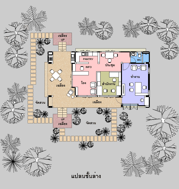 Mini Office สไตล์ Modern ตัวอาคารยกระดับจากพื้นดิน 1.00 ม. ใช้เป็น Mini Office หรือสำนักงานขนาดเล็กได้ รูปทรงภายนอกเป็นสไตล์ Modern ดูทันสมัย สวยงาม เน้นทางเข้าบ้าน ด้วยบันไดทางขึ้น มีเฉลียงยาวด้านหน้า ภายในมีส่วนต้อนรับ โปร่งโล่ง ใช้ติดต่องานบริษัท ด้านในเป็นส่วนทำงานของพนักงาน มีห้องทำงานผู้จัดการ มีส่วนที่ใช้นั่งประชุม คุยงาน หรือใช้เป็นส่วนทานอาหารได้ พร้อมส่วนเตรียมอาหาร Pantry มีห้องน้ำ ชั้นล่าง