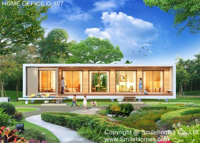 Home Office สไตล์ Modern ตัวอาคารยกระดับจากพื้นดิน 1.00 ม. ใช้เป็น Mini Office หรือสำนักงานขนาดเล็ก พร้อมพักอาศัยได้ รูปทรงภายนอกเป็นสไตล์ Modern ดูทันสมัย สวยงาม เน้นทางเข้า ด้วยบันไดทางขึ้น มีเฉลียงยาวด้านหน้า ภายในมีส่วนต้อนรับ โปร่งโล่ง ใช้ติดต่องานบริษัท ด้านในเป็นส่วนทำงานของพนักงาน มีห้องทำงานผุ้จัดการ มีห้องประชุม คุยงาน หรือใช้เป็นส่วนทานอาหารได้ พร้อมส่วนเตรียมอาหาร Pantry ด้านในมีห้องนอนใหญ่ ที่เป็นส่วนตัว พร้อมห้องน้ำในตัว และมีเฉลียงนั่งเล่น นอกชานขนาดใหญ่ด้านหน้า