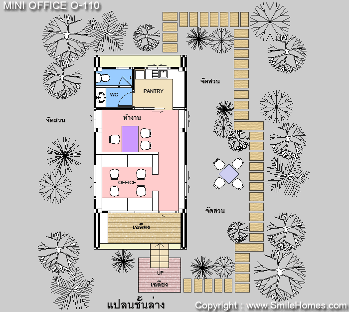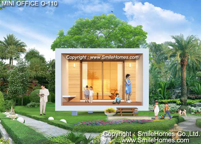 แบบ Mini Office สไตล์ Modern - เป็นแบบ Mini Office ขนาดเล็ก อยู่สบาย ใกล้ชิดธรรมชาติ เน้นการประหยัดพลังงาน โดยตัวอาคารยกระดับจากพื้นดิน 1.00 ม. : ใช้เป็นสำนักงาน ขนาดเล็กชั้นเดียว มีส่วนสำนักงาน และห้องน้ำ รูปทรงภายนอกเป็นสไตล์ Modern ดูทันสมัย สวยงาม ด้านหน้าเป็นเฉลียงนั่งเล่น ภายในเป็นส่วนสำนักงาน สามารถจัดเป็นส่วนทำงานของพนักงาน และส่วนทำงานผู้จัดการด้านหลัง ด้านหลังมีส่วน Pantry สำหรับชงกาแฟ และห้องน้ำ ชั้นล่าง