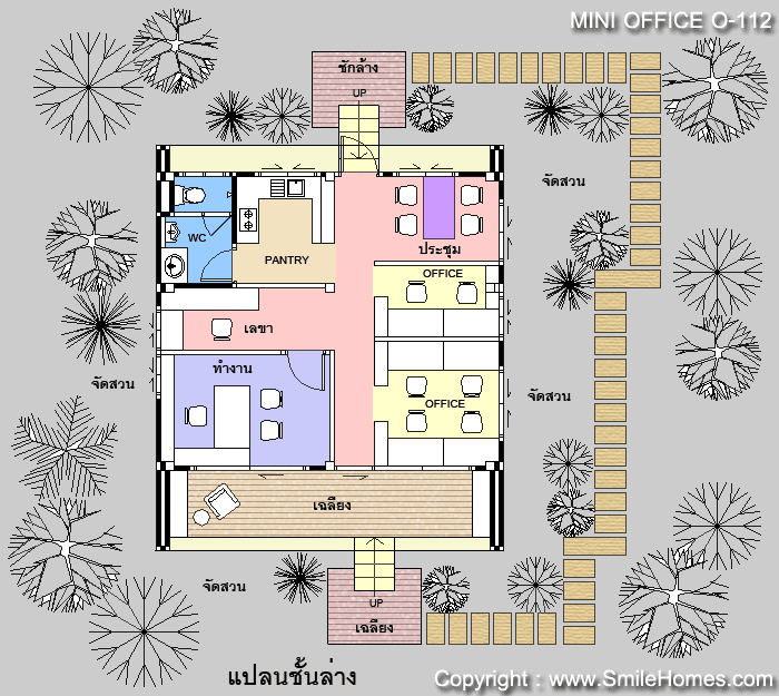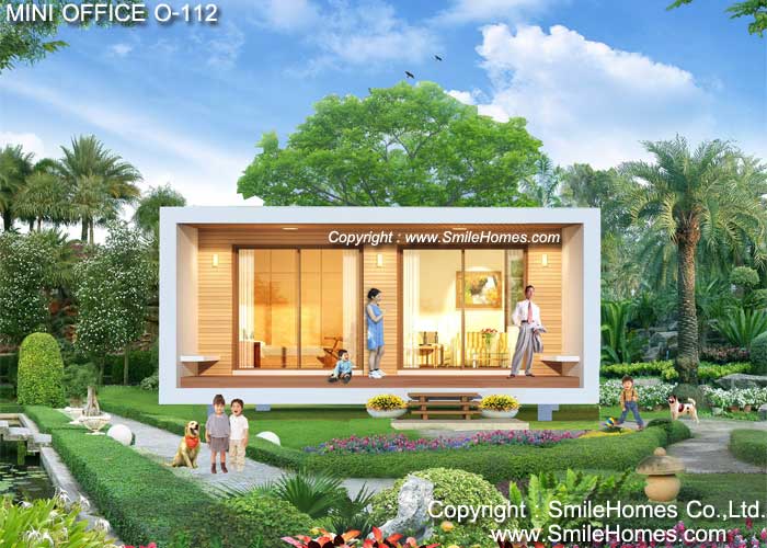 แบบ Mini Office สไตล์ Modern - เป็นแบบ Mini Office ขนาดเล็ก อยู่สบาย ใกล้ชิดธรรมชาติ เน้นการประหยัดพลังงาน โดยตัวอาคารยกระดับจากพื้นดิน 1.00 ม. : ใช้เป็นสำนักงาน ขนาดเล็กชั้นเดียว รูปทรงภายนอกเป็นสไตล์ Modern ดูทันสมัย สวยงาม ด้านหน้าเป็นเฉลียงนั่งเล่น ภายในเป็นส่วนสำนักงาน สามารถจัดเป็นส่วนทำงานของพนักงาน และส่วนทำงานผู้จัดการ มีส่วนประชุม คุยงาน ส่วน Pantry สำหรับชงกาแฟ และห้องน้ำ ชั้นล่าง