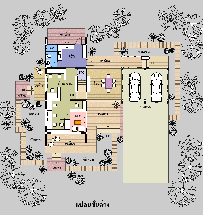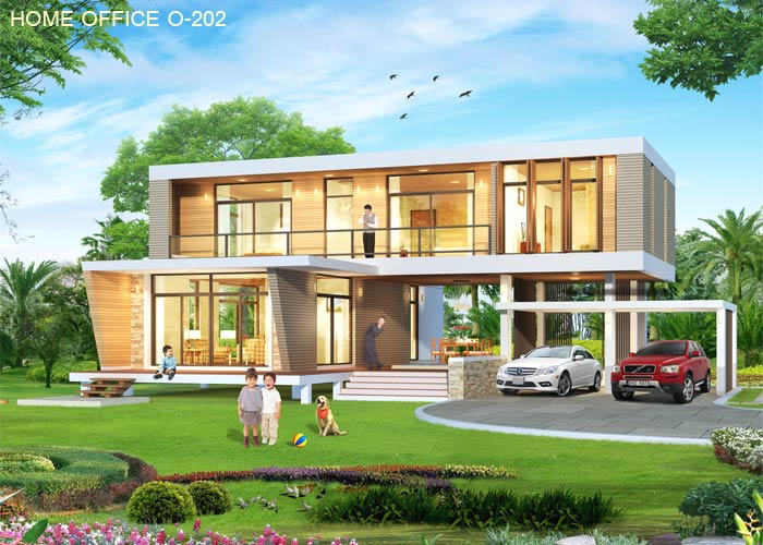 Home Office สไตล์ Modern ใช้เป็นสำนักงานและส่วนพักอาศัย ออกแบบเน้นการประหยัดพลังงาน เป็นอาคารยกระดับ ใต้ถุนโล่ง เป็นโฮมออฟฟิศ 2 ชั้น มี ส่วนสำนักงาน และพักอาศัย มี 2 ห้องนอน 3 ห้องน้ำ ที่จอดรถ 2 คัน รูปทรงภายนอกเป็นสไตล์ Modern ดูทันสมัย สวยงาม โปร่งโล่ง ชั้นล่างเป็นใต้ถุนโล่ง มีเฉลียงด้านหน้า เล่นระดับโดยการยกพื้นขึ้น มีบันไดทางขึ้น ภายในเป็นส่วนต้อนรับ ติดต่องานบริษัท มีส่วนสำนักงานด้านใน มีส่วนครัว พร้อมห้องน้ำ ด้านนอกเป็นส่วนใต้ถุนโล่ง ขนาดใหญ่ ใช้เป็นส่วนนั่งเล่น หรือนั่งประชุมคุยงาน ชั้นบนมีห้องนั่งเล่น และทานอาหาร มี 2 ห้องนอน มีห้องนอนใหญ่ พร้อมห้องน้ำในตัว และห้องนอน 2 เป็นห้องนอนขนาดกลาง ด้านหลังเป็นส่วนเตรียมอาหาร Pantry และมีระเบียงขนาดยาวด้านหน้า และราวระเบียงกันตก ทำเป็นกระจกนิรภัยแบบใส เพื่อความโปร่งโล่ง ด้านนอกเป็นเฉลียงนอกชานขนาดใหญ่ ใช้เป็นที่นั่งเล่นรับลม หรือใช้สังสรรค์สำหรับครอบครัวได้ ชั้นล่าง ชั้นบน