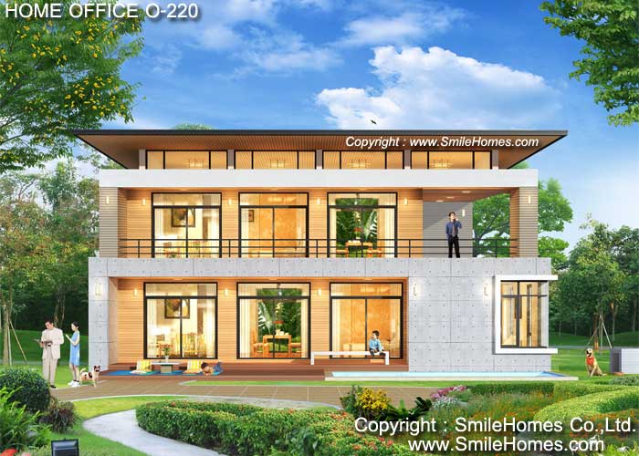 Home Office สไตล์ Modern ใช้เป็นสำนักงาน และส่วนพักอาศัย ออกแบบเน้นการประหยัดพลังงาน : เป็นโฮมออฟฟิศ 2 ชั้น ชั้นล่างเป็นสำนักงาน ชั้นบนใช้พักอาศัย มี 2 ห้องนอน 4 ห้องน้ำ รูปทรงภายนอกเป็นสไตล์ Modern ดูทันสมัย สวยงาม โปร่งโล่ง ชั้นบนยกฝ้าเพดานสูงถึง 3.5 ม. มีช่องแสง Sky-Light ด้านบน หลังคาเป็น Metal Sheet ที่ดูทันสมัย คลุมรอบตัวบ้านเพื่อกันแดดกันฝน ชั้นล่าง มีเฉลียงต้อนรับด้านหน้า ภายในเป็นส่วนสำนักงาน มีส่วนโถงต้อนรับ สำหรับติดต่องาน มีส่วน Office สำนักงาน มีห้องประชุมแยกเป็นสัดส่วน มีห้องทำงานผู้จัดการ มีส่วน Pantry สำหรับชงกาแฟ มีห้องน้ำพนักงาน ชาย-หยิง แยกเป็นสัดส่วน ชั้นบนมีส่วนโถงกว้าง สำหรับรับแขก และทานอาหาร พร้อมระเบียงยาวด้านหน้า และเฉลียงนอกชานขนาดใหญ่ด้านข้าง สามารถใช้เป็นที่จัดเลี้ยง หรือวางโต๊ะทานอาหารได้ มีห้องนอนใหญ่ พร้อมส่วนแต่งตัวแบบ Walk-In Closet และห้องน้ำในตัวที่มีสุขภัณฑ์ครบชุด มีห้องนอน 2 เป็นห้องขนาดกลาง และห้องน้ำส่วนกลาง และห้องพระ และห้องเก็บของ ชั้นล่าง ชั้นบน