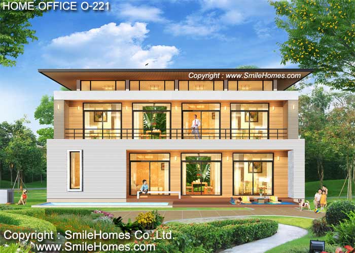 Home Office สไตล์ Modern ใช้เป็นสำนักงาน และส่วนพักอาศัย ออกแบบเน้นการประหยัดพลังงาน : เป็นโฮมออฟฟิศ 2 ชั้น ชั้นล่างเป็นสำนักงาน ชั้นบนใช้พักอาศัย มี 3 ห้องนอน 3 ห้องน้ำ รูปทรงภายนอกเป็นสไตล์ Modern ดูทันสมัย สวยงาม โปร่งโล่ง ชั้นบนยกฝ้าเพดานสูงถึง 3.5 ม. มีช่องแสง Sky-Light ด้านบน หลังคาเป็น Metal Sheet ที่ดูทันสมัย คลุมรอบตัวบ้านเพื่อกันแดดกันฝน ชั้นล่าง มีเฉลียงต้อนรับด้านหน้า ภายในเป็นส่วนสำนักงาน มีส่วนโถงต้อนรับ สำหรับติดต่องาน มีส่วน Office สำนักงาน มีห้องประชุมแยกเป็นสัดส่วน มีห้องทำงานผู้จัดการ มีส่วน Pantry สำหรับชงกาแฟ มีห้องน้ำพนักงาน ชาย-หยิง แยกเป็นสัดส่วน ชั้นบนมีส่วนโถงกว้าง สำหรับรับแขก และทานอาหาร พร้อมระเบียงยาวด้านหน้า และเฉลียงนอกชานขนาดใหญ่ด้านข้าง สามารถใช้เป็นที่จัดเลี้ยง หรือวางโต๊ะทานอาหารได้ มีห้องนอนใหญ่ พร้อมส่วนแต่งตัวแบบ Walk-In Closet และห้องน้ำในตัวที่มีสุขภัณฑ์ครบชุด มีห้องนอน 2 เป็นห้องขนาดกลาง และห้องน้ำส่วนกลาง และห้องพระ และห้องเก็บของ ชั้นล่าง ชั้นบน