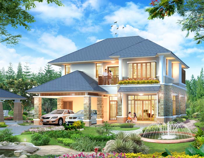 แบบบ้าน A-006 บ้านสไตล์ Modern Oriental รูปทรงทันสมัย สวยงาม โดดเด่น มีเอกลักษณ์ ตกแต่งวัสดุภายนอกบ้านด้วยหินธรรมชาติ เป็นแบบบ้านอยู่สบาย ใกล้ชิดธรรมชาติ เน้นการประหยัดพลังงาน เป็นบ้าน 3 ห้องนอน 5 ห้องน้ำ ที่จอดรถ 2 คัน ตัวบ้านมีเฉลียงด้านหน้า ติดกับส่วนจอดรถ ภายในเป็นห้องรับแขกโปร่งโล่ง ที่มีหน้าต่าง Bay Window ขนาดใหญ่ ต่อเนื่องกับส่วนทานอาหาร เชื่อมต่อกับส่วนเตรียมอาหาร Pantry ที่สามารถวางชุดเคาน์เตอร์บาร์ได้ พร้อมห้องครัวไทยเป็นสัดส่วน ด้านหลังมีห้องคนใช้ และส่วนซักล้าง ชั้นบน มีห้องนอนใหญ่ สำหรับความเป็นส่วนตัว เพราะมีทั้งส่วนแต่งตัว และห้องน้ำ ซึ่งมีการจัดสวนภายในห้องน้ำที่รับแสงธรรมชาติได้ โดยภายนอกมีผนังระแนงไม้กรองแสง มีระเบียงด้านหน้า พร้อมห้องนอนอีก 2 ห้อง ที่แต่ละห้องมีห้องน้ำส่วนตัว ที่มีสุขภัณฑ์ครบชุด ด้านหลังเป็นกันสาดสำหรับเป็นที่วาง Air ได้