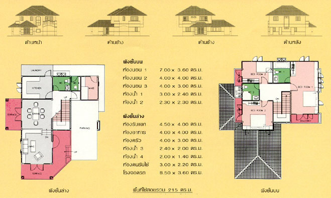 - พื้นที่ใช้สอย 215 ตร.ม.ตัวบ้านกว้าง 12.00 ม. ลึก 14.00 ม.ที่ดินขนาด 60 ตร.ว.ขึ้นไป