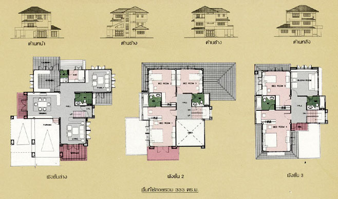 - พื้นที่ใช้สอย 333 ตร.ม.ตัวบ้านกว้าง 15.50 ม. ลึก 14.00 ม.ที่ดินขนาด 85 ตร.ว.ขึ้นไป