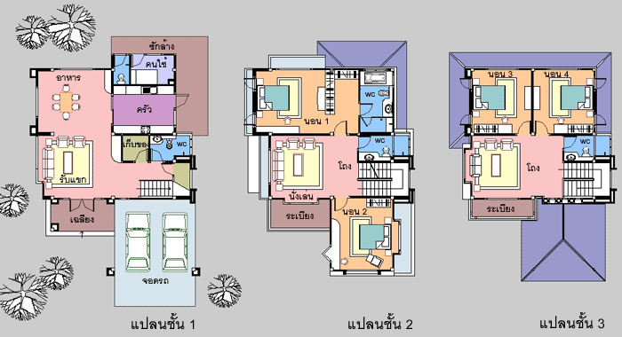 แบบบ้าน C-502: บ้านสไตล์ Modern แบบบ้านอยู่สบาย ใกล้ชิดธรรมชาติ เน้นการประหยัดพลังงาน เป็นบ้าน 4 ห้องนอน 5 ห้องน้ำ ที่จอดรถ 2 คัน รูปทรงทันสมัย โดดเด่น สวยงาม มีเอกลักษณ์เฉพาะตัว ให้ความรู้สึกร่มรื่น น่าอยู่ ในบรรยากาศของการพักผ่อน เฉลียงด้านหน้ากว้างขวาง ต่อจากส่วนจอดรถ ภายในเป็นห้องรับแขกโปร่งโล่ง มี Bay window ที่เป็นหน้าต่างขนาดใหญ่ ต่อเนื่องกับส่วนทานอาหาร ห้องครัวเป็นสัดส่วน มีห้องคนใช้พร้อมห้องน้ำ ชั้น 2 มีห้องนั่งเล่น ดูทีวีขนาดใหญ่ มีระเบียงด้านหน้า มีห้องนอนใหญ่ที่มี ห้องแต่งตัว Walk-in Closet และห้องน้ำใหญ่ส่วนตัว ที่มีสุขภัณฑ์ครบชุด และห้องนอนขนาดกลางด้านหน้า ชั้น 3 มีห้องนอนขนาดกลาง 2 ห้อง และมีห้องโถงใหญ่ที่สามารถปรับเป็นห้องนอนหรือห้องพระได้ พร้อมระเบียงด้านหน้า ตัวบ้านสามารถดัดแปลง ต่อเติมสำหรับการขยายตัวในอนาคตได้