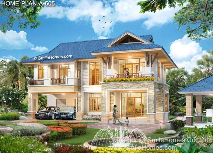 แบบบ้าน A-505 บ้านสไตล์ Modern Thai Resort รูปทรงไทยประยุกต์ ที่ดูทันสมัย สวยงาม โดดเด่น มีเอกลักษณ์เฉพาะตัว ตกแต่งวัสดุภายนอกบ้านด้วยหินธรรมชาติ เป็นแบบบ้านอยู่สบาย ใกล้ชิดธรรมชาติ เน้นการประหยัดพลังงาน เป็นบ้าน 4 ห้องนอน 4 ห้องน้ำ ที่จอดรถ 2 คัน ตัวบ้านมีเฉลียงด้านหน้า ติดกับส่วนจอดรถ ภายในเป็นห้องรับแขกโปร่งโล่ง ที่มีหน้าต่าง Bay Window เป็นกระจกชนมุมขนาดใหญ่ ต่อเนื่องกับส่วนทานอาหาร มีห้องครัว พร้อมห้องครัวไทยภายนอกเป็นสัดส่วน ด้านหลังมีห้องคนใช้ ห้องน้ำคนใช้ และส่วนซักล้าง ชั้นบน มีห้องนั่งเล่นขนาดใหญ่ มีห้องนอนใหญ่ สำหรับความเป็นส่วนตัว เพราะมีทั้งส่วนแต่งตัว Walk-in Closet และห้องน้ำ ขนาดใหญ่ที่มีสุขภัณฑ์ครับชุด มีระเบียงด้านหน้า พร้อมห้องนอนขนาดกลางอีก 2 ห้อง และห้องน้ำ ที่มีสุขภัณฑ์ครบชุด ห้องนอน 2 มีระเบียงส่วนตัว มีกันสาดสำหรับเป็นที่วาง Air ได้