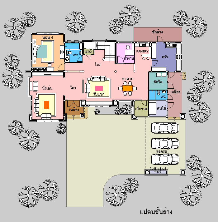 - ที่จอดรถ 3 คัน ( ขนาด 5.50 x 7.30 ม.)