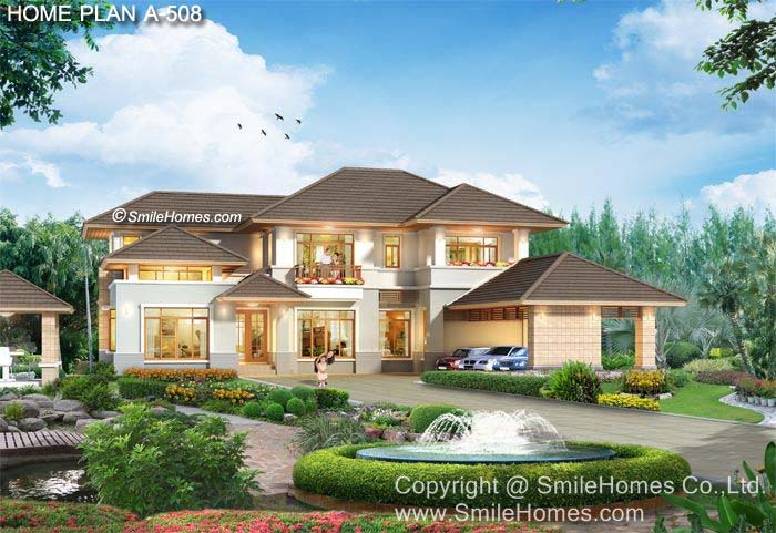 แบบบ้าน A-508 บ้านสไตล์ Modern Tropical : แบบบ้านอยู่สบาย ใกล้ชิดธรรมชาติ เน้นการประหยัดพลังงาน เป็นบ้าน 4 ห้องนอน 5 ห้องน้ำ ที่จอดรถ 3 คัน ตัวบ้านรูปทรงสวยงาม โดดเด่น ด้วยทรงหลังคาหลายระดับ ที่มีเอกลักษณ์เฉพาะตัว ภายในตัวบ้านเน้นความโปร่งโล่ง ด้วยหน้าต่าง และช่องแสงขนาดใหญ่ ชั้นล่าง มีห้องโถงต้อนรับ ห้องนั่งเล่นขนาดใหญ่ แบบฝ้าเพดานทรงสูง ทำเป็น Sky Light รับแสงธรรมชาติ โดดเด่นด้วยทรงหลังคาสูง ห้องรับแขกโปร่งโล่ง ต่อเนื่องกับห้องทานอาหาร ห้องครัวแยกเป็นสัดส่วน มีห้องนอนสำหรับผู้สุงอายุ หรือสำหรับแขก มีห้องทำงานที่เป็นส่วนตัว มีส่วนทำงานแม่บ้าน ส่วนซักรีด ชั้นบนมีห้องนอนใหญ่ สำหรับความเป็นส่วนตัวเพราะมีทั้งส่วนแต่งตัว และห้องน้ำขนาดใหญ่ภายใน ที่มีสุขภัณฑ์ครบชุด พร้อมส่วนจัดสวนภายในห้องน้ำ มีระเบียงใหญ่ด้านหน้า และห้องนอนขนาดกลางอีก 2 ห้องพร้อมห้องน้าส่วนตัว และระเบียงด้านหน้า