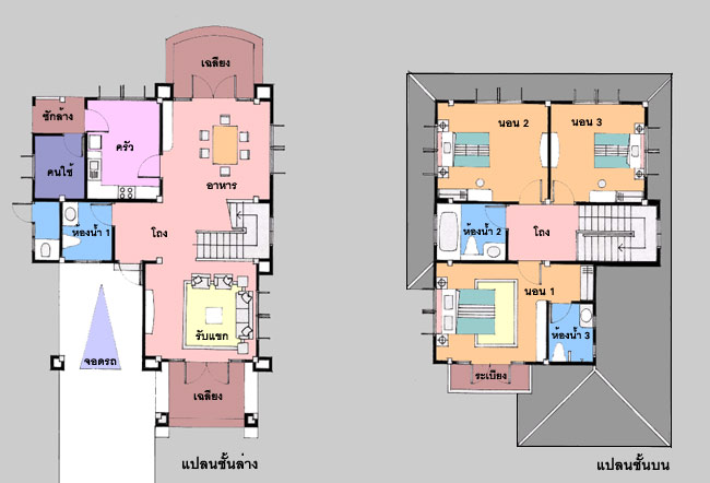 แบบบ้าน A-603: บ้านสไตล์ Garden House แบบบ้านอยู่สบาย ใกล้ชิดธรรมชาติ เน้นการประหยัดพลังงาน เป็นบ้าน 3 ห้องนอน 4ห้องน้ำ ที่จอดรถ 1 คัน ตัวบ้านมีส่วนต่อเนื่องกับพื้นที่ใช้สอยภายใน และภายนอก รูปทรงสวยงาม ให้ความรู้สึกร่มรื่น เฉลียงด้านหน้ากว้างขวาง ต่อจากส่วนจอดรถ ซึ่งสามารถปรับเป็นห้องนอน หรือห้องทำงานได้ ภายในเป็นห้องรับแขกโปร่งโล่ง ต่อเนื่องกับ ห้องทานอาหารที่สามารถออกไป ยังเฉลียงขนาดใหญ่ด้านข้างที่เป็นส่วนตัว ห้องครัวขนาดใหญ่เป็นสัดส่วน มีห้องคนใช้ และห้องน้ำคนใช้ และชั้นบนแบ่งเป็นห้องนอนขนาดกลาง 2 ห้องและอีก 1 ห้องนอนใหญ่สำหรับความเป็นส่วนตัว เพราะมีทั้งห้องน้ำภายในและเป็นระเบียงกว้าง สวยงามในรูปแบบเฉพาะตัว