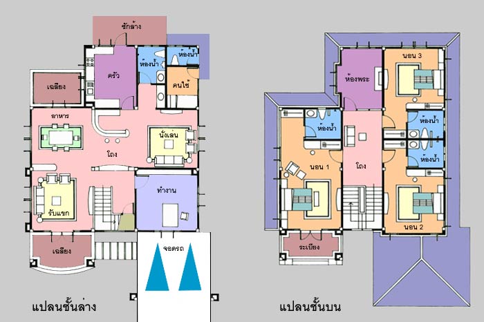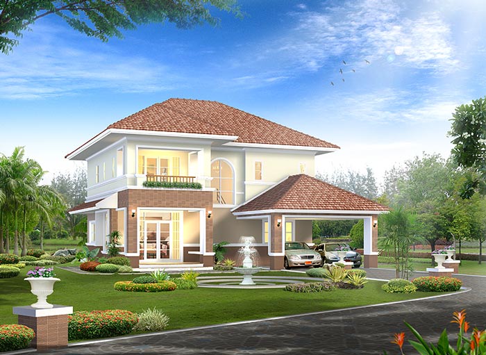 แบบบ้าน A-703 บ้าน 3 ห้องนอน 5 ห้องน้ำ ที่จอดรถ 2 คัน บ้านสไตล์ Modern Contemporary รูปทรงสวยงามให้ความรู้สึกร่มรื่นเย็นสบาย เฉลียงด้านหน้ากว้างขวาง ต่อจากส่วนจอดรถ และชั้นบนเป็นระเบียงภายใต้มุขหลังคาซึ่งเน้นเป็นพิเศษเป็นมุมส่วนตัว สวยงามในรูปแบบเฉพาะตัว เฉลียงด้านหน้ากว้างขวาง เข้าสู่ภายในซึ่งเป็นห้องรับแขกโปร่งโล่ง ห้องทานอาหารที่มีเฉลียงนั่งเล่นขนาดใหญ่ด้านหลังที่เป็นส่วนตัว ห้องครัวขนาดใหญ่เป็นสัดส่วน ต่อเนื่องกับส่วนเตรียมอาหาร มีห้องนั่งเล่น โปร่งสบาย และห้องทำงานเป็นสัดส่วน ซึ่งสามารถปรับเป็นห้องนอนได้ ชั้นบนมีโถงนั่งเล่น มีห้องนอนขนาดกลางที่มีห้องน้ำในตัว 2 ห้อง และอีก 1 ห้องนอนใหญ่สำหรับความเป็นส่วนตัว เพราะมีทั้งส่วนแต่งตัว และห้องน้ำภายใน และระเบียงด้านหน้าซึ่งเปิดกว้าง มีห้องพระด้านหลัง