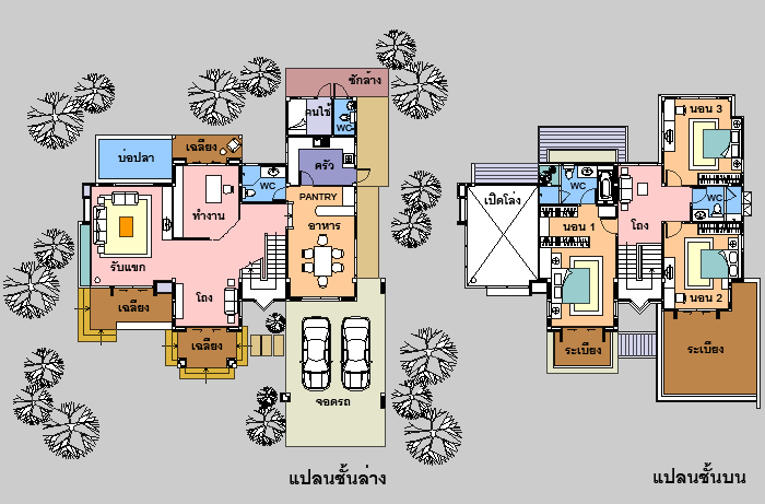 แบบบ้าน A-707 บ้านสไตล์ Modern รูปทรงทันสมัย สวยงาม โดดเด่น มีเอกลักษณ์เฉพาะตัว เป็นแบบบ้านอยู่สบาย ใกล้ชิดธรรมชาติ เน้นการประหยัดพลังงาน เป็นบ้าน 3 ห้องนอน 4 ห้องน้ำ ที่จอดรถ 2 คัน ตัวบ้านมีเฉลียงด้านหน้า ใกล้กับส่วนจอดรถ ภายในเป็นโถงต้อนรับ มีห้องรับแขกโปร่งโล่ง สุง 2 ชั้น มีหน้าต่าง เป็นกระจกขนาดใหญ่ ด้านหน้ามีเฉลียงนอกชานสำหรับนั่งเล่น มีห้องทำงานที่เป็นส่วนตัว ซึ่งสามารถปรับเป็นห้องนอนหรือห้องนั่งเล่นได้ มีเฉลียงด้านหลัง มีบ่อเลี้ยงปลาด้านข้าง ส่วนห้องทานอาหาร มีเล่นระดับ ใกล้ห้องอาหาร มีส่วนเตรียมอาหาร Pantry ที่สามารถวางชุดเคาน์เตอร์บาร์ได้ พร้อมห้องครัวเป็นสัดส่วน ด้านหลังมีห้องคนใช้ ห้องน้ำคนใช้ และส่วนซักล้าง ชั้นบน มีห้องนอนใหญ่ พร้อมส่วนแต่งตัว และห้องน้ำ ขนาดใหญ่ที่มีสุขภัณฑ์ครับชุด พร้อมมีการจัดสวนภายในห้องน้ำที่รับแสงธรรมชาติได้ โดยภายนอกมีผนังระแนงไม้กรองแสง มีระเบียงด้านหน้า พร้อมห้องนอนอีก 2 ห้อง มีห้องน้ำส่วนตัว ที่มีสุขภัณฑ์ครบชุด ด้านหน้าห้องนอน 2 มีระเบียงขนาดใหญ่