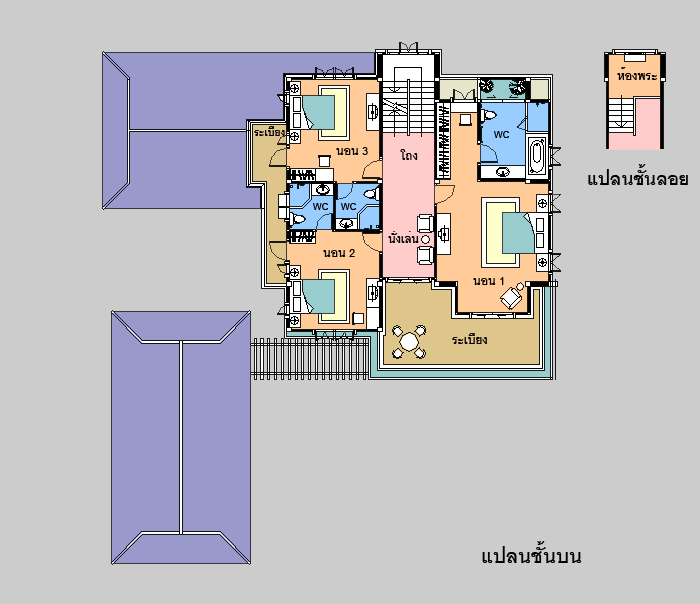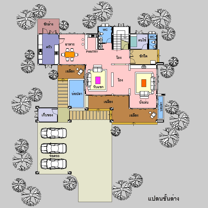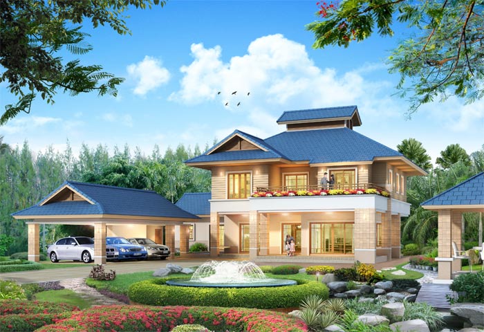 แบบบ้าน A-709 บ้านสไตล์ Thai Resort : แบบบ้านอยู่สบาย ใกล้ชิดธรรมชาติ เน้นการประหยัดพลังงาน เป็นบ้าน 3 ห้องนอน 5 ห้องน้ำ ที่จอดรถ 3 คัน ตัวบ้านรูปทรงสวยงาม โดดเด่น สไตล์ Resort ที่มีเอกลักษณ์เฉพาะตัว มีหลังคาเล่นระดับ 2 ชั้นเพื่อความสวยงาม และช่วยระบายความร้อน ชั้นล่างมีเฉลียงนั่งเล่นนอกชานโดยรอบ และบ่อเลี้ยงปลา ให้ความรู้สึกร่มรื่นเย็นสบาย ภายในตัวบ้านเน้นความโปร่งโล่ง ด้วยหน้าต่าง และช่องแสงขนาดใหญ มีห้องโถง ห้องนั่งเล่นที่เป็นส่วนตัว ห้องรับแขกโปร่งโล่ง ห้องทานอาหาร ห้องครัวแยกเป็นสัดส่วน ชั้นบนมีห้องโถงที่ออกเฉลียงใหญ่ภายนอกได้ มีห้องนอนใหญ่ สำหรับความเป็นส่วนตัวเพราะมีทั้งส่วนแต่งตัว และห้องน้ำขนาดใหญ่ภายใน ที่มีสุขภัณฑ์ครบชุด รวมทั้งอ่างระบบน้ำวน และห้องนอนขนาดกลางอีก 2 ห้องพร้อมห้องน้าส่วนตัว และระเบียงด้านข้าง ด้านหน้ามีระเบียงนอกชานขนาดใหญ่ สำหรับนั่งเล่น มีส่วนจอดรถแยกส่วนออกมาต่างหาก รายละเอียดแบบบ้าน A-709 ** อาคารจอดรถ แยกออกมาจากตัวบ้าน ** สามารถขยับตำแหน่งที่จอดรถได้ ตามลักษณะ รูปทรงที่ดินของท่าน ** ชั้นสอง ชั้นใต้หลังคา