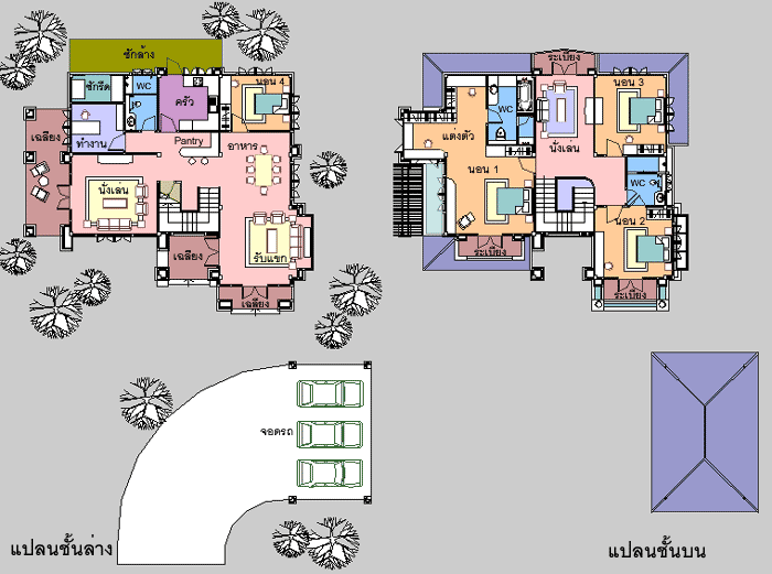 แบบบ้าน A-806 บ้านสไตล์ Tropical Classic รูปทรงสวยงาม โดดเด่น มีเอกลักษณ์เฉพาะตัว ให้ความรู้สึกร่มรื่นเย็นสบาย บ้าน 4 ห้องนอน 3 ห้องน้ำ มีอาคารจอดรถ 3 คัน แยกออกมาจากตัวบ้าน ตัวบ้านมีเฉลียงด้านหน้ากว้างขวาง โดดเด่น มีซุ้มทางเข้าที่สูงโปร่ง 2 ชั้น พร้อมรูปทรงหลังคาที่มีเอกลักษณ์ และเฉลียงด้านหน้า เข้าสู่ภายในซึ่งเป็นห้องรับแขกขนาดใหญ่ มี Bay Window เป็นกระจกสูงโปร่ง ต่อเนื่องไปยังห้องทานอาหาร ด้านหลังมีห้องนอน สำหรับผู้สูงอายุที่เป็นส่วนตัว ด้านซ้ายมีห้องนั่งเล่น หรือห้องโฮมเธียเตอร์ขนาดใหญ่ ที่มีเฉลียงนอกชานนั่งเล่นที่เป็นส่วนตัว มีห้องทำงาน มีส่วนซักรีด ชั้นบนมีส่วนนั่งเล่นซึ่งออกระเบียงได้ มีห้องนอนใหญ่ สำหรับความเป็นส่วนตัว พร้อมห้องแต่งตัวแบบ Walk-in Closet ขนาดใหญ่ ด้านบนเป็นเพดานสูงที่มี หน้าต่าง Skylight รับแสงธรรมชาติ พร้อมทั้งห้องน้ำขนาดใหญ่ภายใน และระเบียงด้านหน้าซึ่งเปิดกว้าง และมีห้องนอนขนาดกลางอีก 2 ห้อง พร้อมห้องน้ำ ** อาคารจอดรถ แยกออกมาจากตัวบ้าน ** สามารถขยับตำแหน่งที่ตั้งได้ ตามลักษณะที่ดินของท่าน ** ชั้นสอง