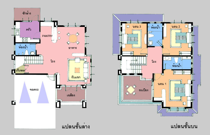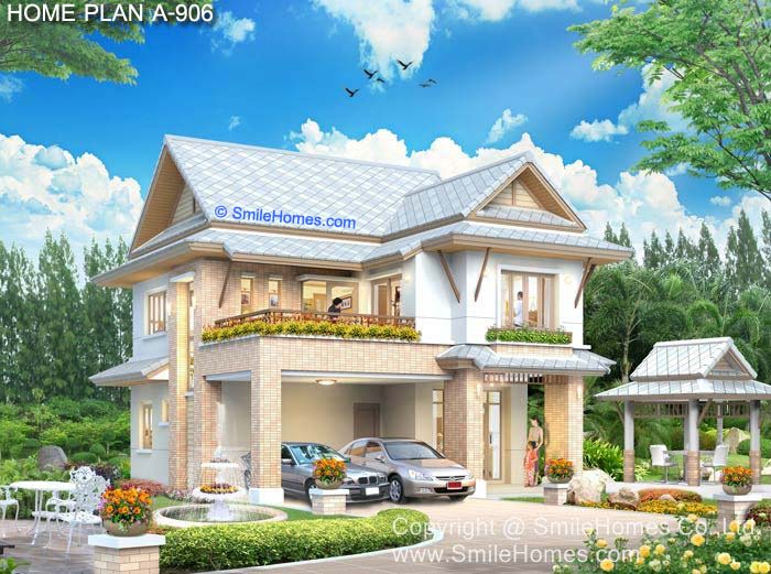 แบบบ้าน A-906 : บ้านสไตล์ Modern Thai Style แบบบ้านอยู่สบาย ใกล้ชิดธรรมชาติ เน้นการประหยัดพลังงาน เป็นบ้าน 3 ห้องนอน 3 ห้องน้ำ ที่จอดรถ 2 คัน รูปทรงไทยประยุกต์ โดดเด่น สวยงาม มีเอกลักษณ์เฉพาะตัว เหมาะกับสภาพภูมิอากาศของไทย ให้ความรู้สึกร่มรื่น น่าอยู่ ในบรรยากาศของการพักผ่อน เฉลียงด้านหน้ากว้างขวาง ต่อจากส่วนจอดรถ ภายในเป็นห้องรับแขกโปร่งโล่ง มี Bay window ที่มีหน้าต่างขนาดใหญ่ ต่อเนื่องกับส่วนทานอาหาร ห้องครัวเป็นสัดส่วน เชื่อมต่อกับส่วน Pantry สามารถวางเคาน์เตอร์บาร์ สำหรับเตรียมอาหาร ชั้นบนมีระเบียง นอกชานนั่งเล่น ขนาดใหญ่ มีห้องนอนขนาดกลาง 2 ห้อง และอีก 1 ห้องนอนใหญ่ สำหรับความเป็นส่วนตัว เพราะมีห้องน้ำภายใน สามารถออกระเบียงได้ ตัวบ้านสามารถดัดแปลง ต่อเติมสำหรับการขยายตัวในอนาคตได้