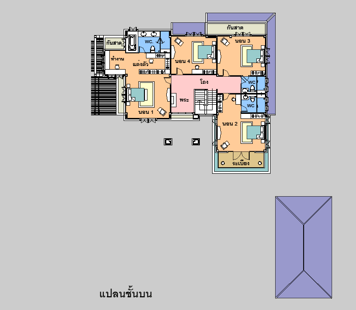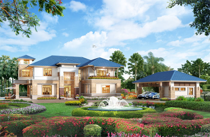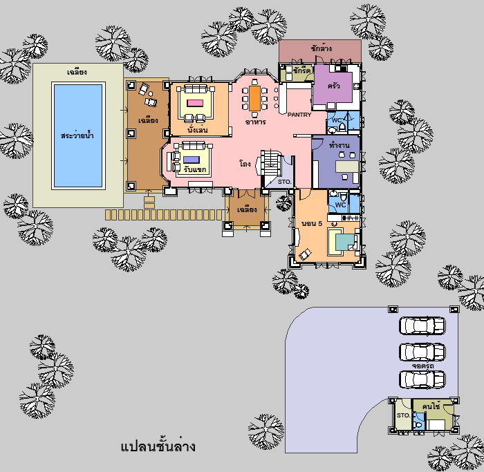 แบบบ้าน A-909 บ้านสไตล์ Modern Oriental รูปทรงสวยงาม โดดเด่น มีเอกลักษณ์เฉพาะตัว ให้ความรู้สึกร่มรื่นเย็นสบาย เป็นบ้าน 5 ห้องนอน 6 ห้องน้ำ มีส่วนจอดรถ 3 คัน มีเฉลียงใหญ่ด้านหน้า โดดเด่นด้วยซุ้มทางเข้าสูง 2 ชั้น ที่มีเอกลักษณ์เฉพาะตัว เข้าสู่ภายในซึ่งเป็นห้องโถงต้อนรับ โปร่งสบาย มีห้องรับแขกขนาดใหญ่ ที่มี Bay Window เป็นกระจกสูง ด้านข้าง มีห้องนั่งเล่นขนาดใหญ่ ในมุมส่วนตัว ที่มีเฉลียงนอกชานด้านข้างขนาดใหญ่ สำหรับนั่งเล่น แบบ Outdoor ด้านบนเป็นหลังคาไม้ระแนงกรองแสง ด้านข้างสามารถทำสระว่ายน้ำหรือจัดสวนสวยๆ ได้ มีห้องทานอาหาร และห้องครัวเป็นสัดส่วน พร้อมส่วน Pantry สำหรับเตรียมอาหาร และห้องซักรีด มีห้องนอนสำหรับแขก หรือผู้สูงอายุที่เป็นส่วนตัว พร้อมห้องน้ำในตัว มีห้องทำงาน ที่สามารถปรับเป็นห้องนอนเพิ่มได้ มีห้องน้ำส่วนกลาง ส่วนอาคารจอดรถแยกออกมาต่างหาก สามารถจัดวางตำแหน่งที่จอดรถ ให้เหมาะสมตามรูปทรงที่ดินของท่านได้ พร้อมห้องเก็บของ และห้องคนใช้พร้อมห้องน้ำ ชั้นบนมีห้องนอนใหญ่ พร้อมห้องแต่งตัวแบบ Walk-in Closet มีมุมทำงานส่วนตัว ที่ด้านบนเป็นเพดานสูงที่มี หน้าต่าง Skylight รับแสงธรรมชาติ สร้างจุดเด่นให้ตัวบ้าน มีห้องน้ำขนาดใหญ่ ที่มีสุขภัณฑ์ครบชุด และมีห้องนอนขนาดใหญ่และขนาดกลางอีก 3 ห้อง พร้อมห้องน้ำส่วนตัว ที่มีสุขภัณฑ์ครบชุด มีห้องพระด้านหน้า และระเบียงภายนอกห้องนอน 2 ด้านหลังมีกันสาด สำหรับเป็นที่วางแอร์ หรือปรับเป็นระเบียงได้ ** อาคารจอดรถ แยกออกมาจากตัวบ้าน ** สามารถจัดวางตำแหน่งที่จอดรถ ให้เหมาะสมตามรูปทรงที่ดินของท่านได้ ** ชั้นสอง