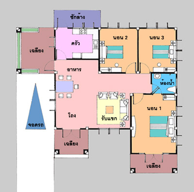 บ้านชั้นเดียว ขนาดปานกลาง ในราคาประหยัด แต่เพียบพร้อมด้วยประโยชน์ใช้สอย มี 3 ห้องนอน 1 ห้องน้ำ รูปทรงภายนอกสวยงาม ให้ความรู้สึกร่มรื่น เน้นทางเข้าด้วยเฉลียง ซึ่งต่อเนื่องกับส่วนอเนกประสงค์ ซึ่งเป็นห้องเปิดโล่ง จัดเป็นส่วนรับแขกและทานอาหาร แยกเป็นสัดส่วน สามารถจัดวางเฟอร์นิเจอร์ แบ่งส่วนการใช้สอย ได้อย่างเหมาะสม สร้างความรู้สึกโปร่งสบาย ในบรรยากาศที่เป็นกันเอง มีครัวที่ต่อเนื่อง กับส่วนทานอาหาร มีเฉลียงนั่งเล่นขนาดใหญ่ด้านข้างสำหรับพักผ่อนตอนเย็น และสามารถดัดแปลง ต่อเติมสำหรับการขยายตัวในอนาคต