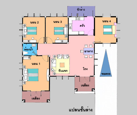 บ้านชั้นเดียว ขนาดปานกลาง ในราคาประหยัด แต่เพียบพร้อมด้วยประโยชน์ใช้สอย มี 4 ห้องนอน 1 ห้องน้ำ ( สามารถปรับเป็น 2 ห้องน้ำได้ ) รูปทรงภายนอกสวยงาม ให้ความรู้สึกร่มรื่น เน้นทางเข้าด้วยเฉลียง ซึ่งต่อเนื่องกับส่วนอเนกประสงค์ ซึ่งเป็นห้องเปิดโล่ง จัดเป็นส่วนรับแขกและทานอาหาร แยกเป็นสัดส่วน สามารถจัดวางเฟอร์นิเจอร์ แบ่งส่วนการใช้สอย ได้อย่างเหมาะสม สร้างความรู้สึกโปร่งสบาย ในบรรยากาศที่เป็นกันเอง มีครัวที่ต่อเนื่อง กับส่วนทานอาหาร มีเฉลียงนั่งเล่นขนาดใหญ่ด้านข้างสำหรับพักผ่อนตอนเย็น และสามารถดัดแปลง ต่อเติมสำหรับการขยายตัวในอนาคต
