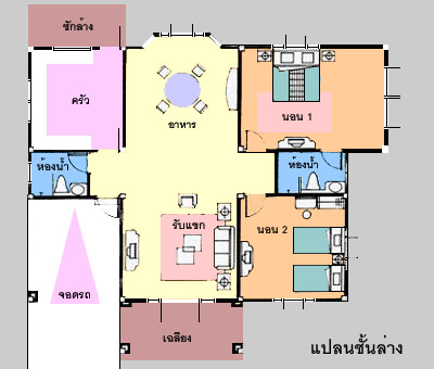 บ้านชั้นเดียว ขนาดพอเหมาะ เพียบพร้อมด้วยประโยชน์ใช้สอย มี 2 ห้องนอน 2 ห้องน้ำ พร้อมที่จอดรถ 1 คัน รูปทรงภายนอกสวยงาม เน้นทางเข้าด้วยเฉลียง ซึ่งต่อเนื่องกับส่วนอเนกประสงค์ ซึ่งเป็นห้องเปิดโล่ง จัดเป็นส่วนรับแขกและทานอาหาร แยกเป็นสัดส่วน สามารถจัดวางเฟอร์นิเจอร์ แบ่งส่วนการใช้สอย ได้อย่างเหมาะสม สร้างความรู้สึกโล่งสบาย ในบรรยากาศที่เป็นกันเอง มีครัวที่ต่อเนื่อง กับส่วนทานอาหาร และส่วนซักล้าง สามารถดัดแปลง ต่อเติมสำหรับการขยายตัวในอนาคตได้