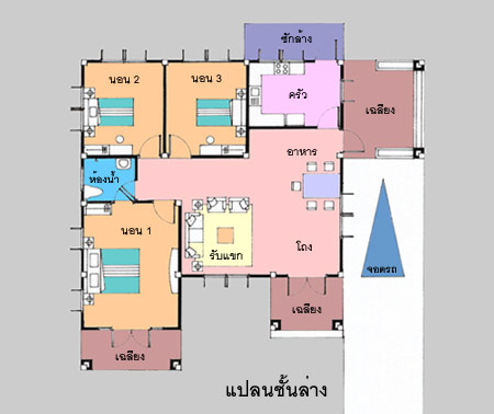 บ้านชั้นเดียว ขนาดปานกลาง ในราคาประหยัด แต่เพียบพร้อมด้วยประโยชน์ใช้สอย มี 3 ห้องนอน 1 ห้องน้ำ รูปทรงภายนอกที่โดดเด่น ด้วยทรงหลังคาที่มีเอกลักษณ์ สวยงาม ให้ความรู้สึกร่มรื่น เน้นทางเข้าด้วยเฉลียง ซึ่งต่อเนื่องกับส่วนอเนกประสงค์ ซึ่งเป็นห้องเปิดโล่ง จัดเป็นส่วนรับแขกและทานอาหาร แยกเป็นสัดส่วน สามารถจัดวางเฟอร์นิเจอร์ แบ่งส่วนการใช้สอย ได้อย่างเหมาะสม สร้างความรู้สึกโปร่งสบาย ในบรรยากาศที่เป็นกันเอง มีครัวที่ต่อเนื่อง กับส่วนทานอาหาร มีเฉลียงนั่งเล่นขนาดใหญ่ด้านข้างสำหรับพักผ่อนตอนเย็น และสามารถดัดแปลง ต่อเติมเป็นห้องนอน หรือห้องทำงานในอนาคตได้