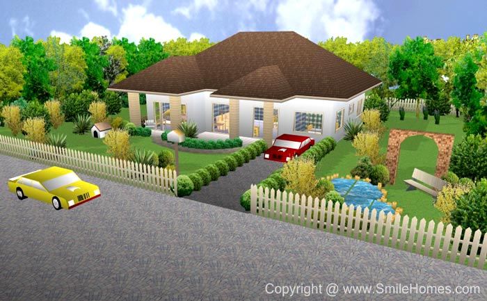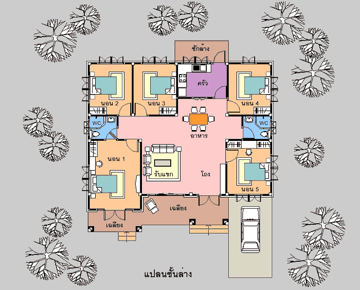 บ้านชั้นเดียว ขนาดปานกลาง ในราคาประหยัด แต่เพียบพร้อมด้วยประโยชน์ใช้สอย มี 5 ห้องนอน 2 ห้องน้ำ รูปทรงภายนอกสวยงาม ให้ความรู้สึกร่มรื่น มีเฉลียงด้านหน้าขนาดใหญ่ ใช้เป็นที่วางชุดนั่งเล่นนอกชานได้ ภายในตัวบ้านเป็นห้องโถงกว้าง จัดเป็นส่วนรับแขก และทานอาหาร แยกเป็นสัดส่วน สามารถจัดวางเฟอร์นิเจอร์ แบ่งส่วนการใช้สอย ได้อย่างเหมาะสม สร้างความรู้สึกโปร่งสบาย ในบรรยากาศที่เป็นกันเอง มีครัวที่ต่อเนื่อง กับส่วนทานอาหาร มีห้องนอนใหญ่ พร้อมห้องน้ำ และห้องนอนขนาดกลางอีก 4 ห้อง พร้อมห้องน้ำส่วนกลาง สามารถดัดแปลง ต่อเติมสำหรับการขยายตัวในอนาคต
