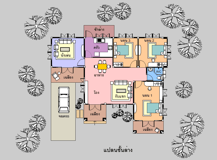 บ้านชั้นเดียว ขนาดปานกลาง ในราคาประหยัด แต่เพียบพร้อมด้วยประโยชน์ใช้สอย มี 3 ห้องนอน 1 ห้องน้ำ รูปทรงภายนอกสวยงาม ให้ความรู้สึกร่มรื่น เน้นทางเข้าด้วยเฉลียงด้านหน้า ภายในตัวบ้านเป็นห้องโถงกว้าง จัดเป็นส่วนรับแขก และทานอาหาร แยกเป็นสัดส่วน สร้างความรู้สึกโปร่งสบาย ในบรรยากาศที่เป็นกันเอง มีครัวที่ต่อเนื่อง กับส่วนทานอาหาร มีห้องนอนใหญ่ และห้องนอนขนาดกลางอีก 2 ห้อง พร้อมห้องน้ำส่วนกลาง มีห้องนั่งเล่น หรือห้องโฮมเธียเตอร์ ซึ่งมีเฉลียงนอกชานด้านหน้าสำหรับวางชุดนั่งเล่น สามารถดัดแปลงเป็นห้องนอนหรือห้องทำงานได้
