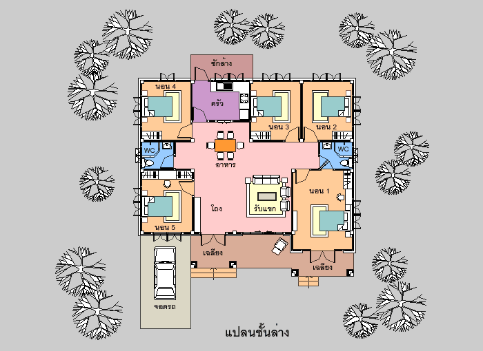 บ้านชั้นเดียว ขนาดปานกลาง ในราคาประหยัด แต่เพียบพร้อมด้วยประโยชน์ใช้สอย มี 5 ห้องนอน 2 ห้องน้ำ รูปทรงภายนอกสวยงาม ให้ความรู้สึกร่มรื่น มีเฉลียงด้านหน้าขนาดใหญ่ ใช้เป็นที่วางชุดนั่งเล่นนอกชานได้ ภายในตัวบ้านเป็นห้องโถงกว้าง จัดเป็นส่วนรับแขก และทานอาหาร แยกเป็นสัดส่วน สามารถจัดวางเฟอร์นิเจอร์ แบ่งส่วนการใช้สอย ได้อย่างเหมาะสม สร้างความรู้สึกโปร่งสบาย ในบรรยากาศที่เป็นกันเอง มีครัวที่ต่อเนื่อง กับส่วนทานอาหาร มีห้องนอนใหญ่ พร้อมห้องน้ำ และห้องนอนขนาดกลางอีก 4 ห้อง พร้อมห้องน้ำส่วนกลาง สามารถดัดแปลง ต่อเติมสำหรับการขยายตัวในอนาคต