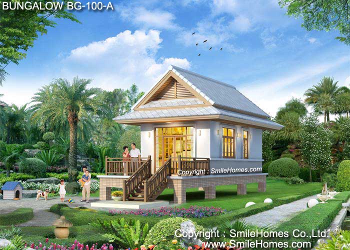 แบบบังกะโล หรือบ้านพักตากอากาศ สไตล์ Modern Thai - เป็นแบบบังกะโลอยู่สบาย ใกล้ชิดธรรมชาติ เน้นการประหยัดพลังงาน โดยตัวอาคารยกระดับจากพื้นดิน 1.20 ม. ใช้เป็นบ้านพักตากอากาศ, เป็นเรือนพักผ่อนในสวน, เรือนริมน้ำ, เรือนรับรอง หรือทำเป็น Resort สำหรับให้เช่าได้ : เป็นอาคารชั้นเดียว มี 1 ห้องนอน 1 ห้องน้ำ รูปทรงภายนอกสวยงาม ด้านหน้าเป็นเฉลียงนั่งเล่น ภายในเป็นส่วนห้องพัก สามารถวางเตียงนอน ชุดโซฟา โต๊ะทานอาหาร ด้านหลังมีส่วนเตรียมอาหาร Pantry และห้องน้ำ ชั้นล่าง
