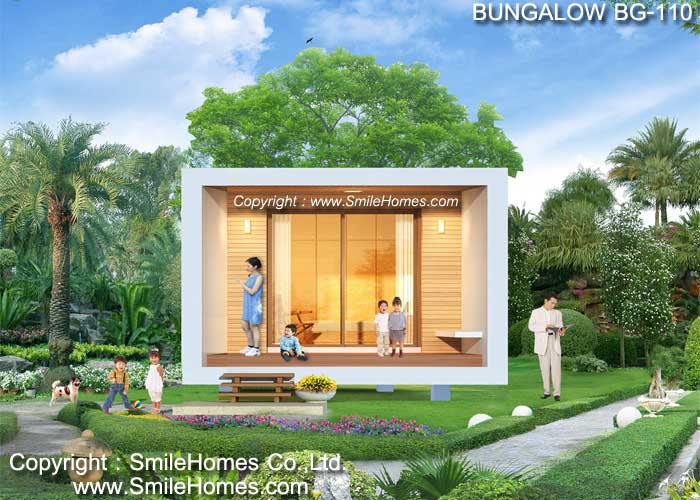 แบบบังกะโล หรือบ้านพักตากอากาศ สไตล์ Modern - เป็นแบบบังกะโลอยู่สบาย ใกล้ชิดธรรมชาติ เน้นการประหยัดพลังงาน โดยตัวอาคารยกระดับจากพื้นดิน 1.00 ม. ใช้เป็นบ้านพักตากอากาศ, เป็นเรือนพักผ่อนในสวน, เรือนริมน้ำ, เรือนรับรอง หรือทำเป็น Resort สำหรับให้เช่าได้ : เป็นอาคารชั้นเดียว มี 1 ห้องนอน 1 ห้องน้ำ รูปทรงภายนอกเป็นสไตล์ Modern ดูทันสมัย สวยงาม ด้านหน้าเป็นเฉลียงนั่งเล่น ภายในเป็นส่วนห้องพัก สามารถวางเตียงนอน ชุดโซฟา โต๊ะทานอาหาร ด้านหลังมีส่วนเตรียมอาหาร Pantry และห้องน้ำ พร้อมส่วนซักล้างด้านหลัง ชั้นล่าง