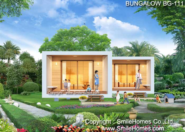 แบบบังกะโล หรือบ้านพักตากอากาศ สไตล์ Modern - เป็นแบบบังกะโลอยู่สบาย ใกล้ชิดธรรมชาติ เน้นการประหยัดพลังงาน โดยตัวอาคารยกระดับจากพื้นดิน 1.00 ม. ใช้เป็นบ้านพักตากอากาศ, เป็นเรือนพักผ่อนในสวน, เรือนริมน้ำ, เรือนรับรอง หรือทำเป็น Resort สำหรับให้เช่าได้ : เป็นบังกะโลชั้นเดียว มี 1 ห้องนอน 1 ห้องน้ำ รูปทรงภายนอกเป็นสไตล์ Modern ดูทันสมัย สวยงาม ด้านหน้าเป็นเฉลียงนั่งเล่น ภายในเป็นส่วนโถงรับแขก สามารถวางชุดโซฟา โต๊ะทานอาหาร มีห้องนอน 1 ห้อง ด้านหลังมีส่วนเตรียมอาหาร Pantry และห้องน้ำ พร้อมส่วนซักล้างด้านหลัง