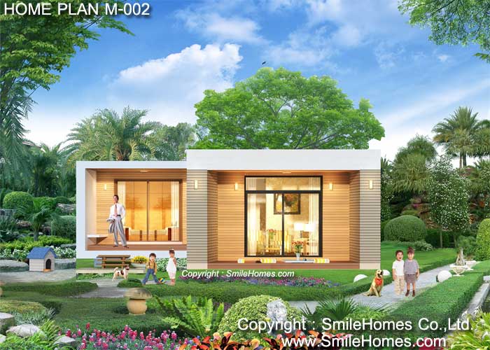 บ้านสไตล์ Modern เป็นแบบบ้านอยู่สบาย ใกล้ชิดธรรมชาติ เน้นการประหยัดพลังงาน เป็นบ้านเล่นระดับ ด้านหน้ายกระดับจากพื้นดิน 0.50 ม. ห้องนอนยกระดับจากพื้นดิน 1.00 ม. ใช้เป็นบ้านพักอาศัย, เป็น Home Office, เป็นเรือนพักผ่อนในสวน, เรือนริมน้ำ, เรือนรับรอง หรือทำเป็น Resort สำหรับให้เช่าได้ : เป็นบ้านชั้นเดียว มี 1 ห้องนอน 1 ห้องน้ำ รูปทรงภายนอกเป็นสไตล์ Modern ดูทันสมัย สวยงาม ด้านหน้าเป็นเฉลียงนั่งเล่น ภายในเป็นส่วนโถงรับแขก สามารถวางชุดโซฟา โต๊ะทานอาหาร มีห้องนอน 1 ห้อง ด้านหลังมีส่วนเตรียมอาหาร Pantry และห้องน้ำ พร้อมส่วนซักล้างด้านหลัง ชั้นล่าง หลังคา
