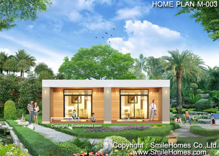 บ้านสไตล์ Modern เป็นแบบบ้านอยู่สบาย ใกล้ชิดธรรมชาติ เน้นการประหยัดพลังงาน เป็นบ้านยกระดับจากพื้นดิน 0.50 ม. ใช้เป็นบ้านพักอาศัย, เป็น Home Office, เป็นเรือนพักผ่อนในสวน, เรือนริมน้ำ, เรือนรับรอง หรือทำเป็น Resort สำหรับให้เช่าได้ : เป็นบ้านชั้นเดียว มี 1 ห้องนอน 1 ห้องน้ำ รูปทรงภายนอกเป็นสไตล์ Modern ดูทันสมัย สวยงาม ด้านหน้าเป็นเฉลียงนั่งเล่น ภายในเป็นส่วนโถงรับแขก และอาหาร มีห้องนอน 1 ห้อง ด้านหลังมีส่วนเตรียมอาหาร Pantry และห้องน้ำ พร้อมส่วนซักล้างด้านหลัง ชั้นล่าง หลังคา